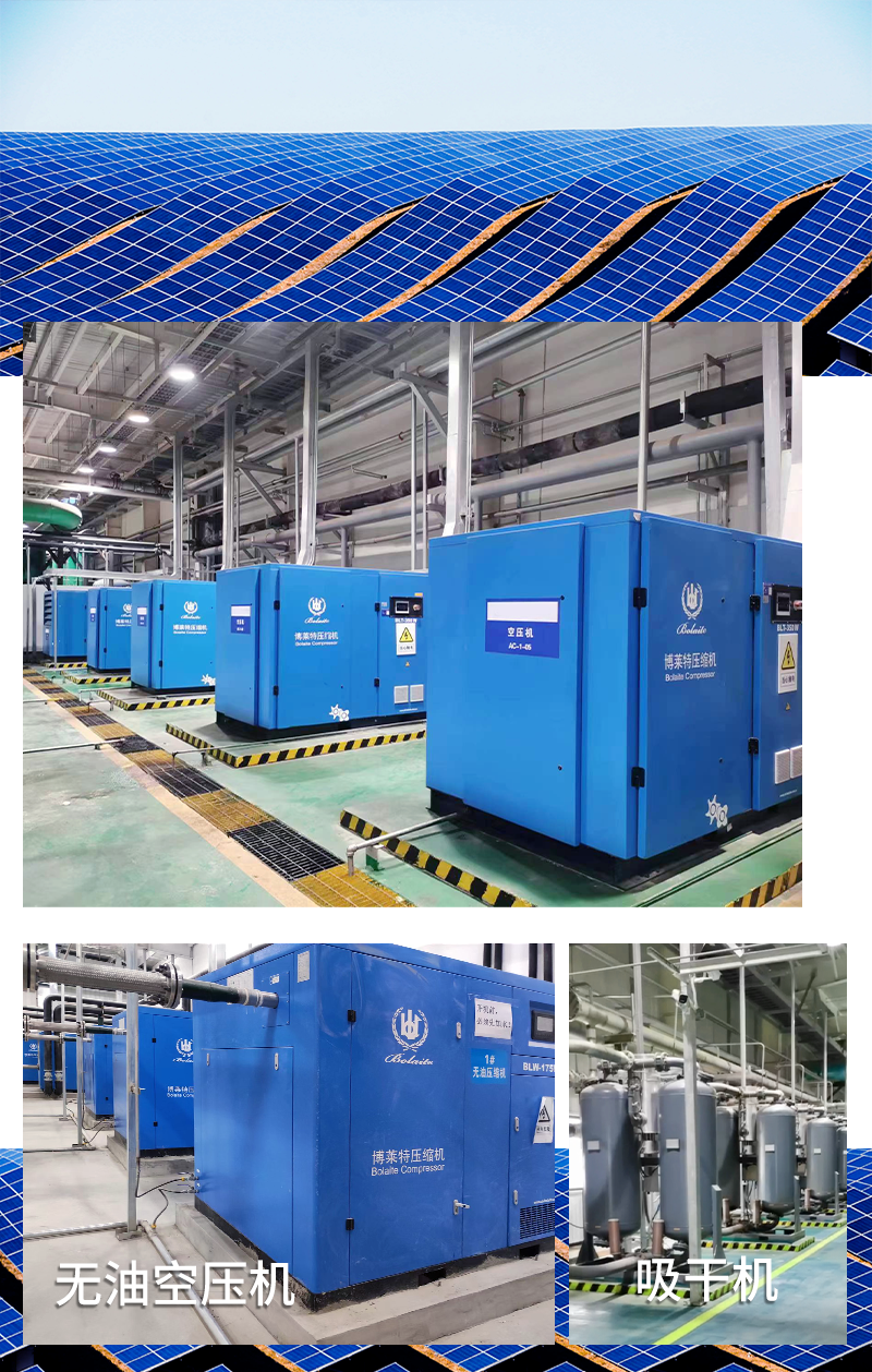 時間來到今年,國內(nèi)某節(jié)能股份有限公司,計劃在五年內(nèi)建設(shè)新能源產(chǎn)業(yè)園區(qū),其中包括:單晶硅棒、單晶切片、異質(zhì)結(jié)電池和光伏組件,并形成完整產(chǎn)業(yè)鏈。其中空壓機站房的建設(shè)是比較重要的一環(huán),對此,該客戶咨詢了一些光伏行業(yè)伙伴,并最終選擇了博萊特品牌。