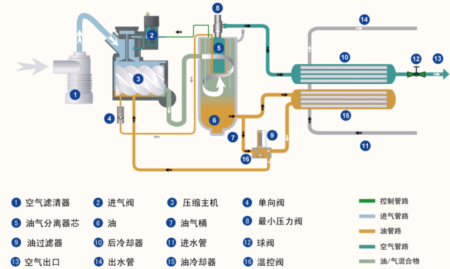 螺桿壓縮機(jī)的核心部件是一對嚙合的螺桿轉(zhuǎn)子,通常由一個主動轉(zhuǎn)子(陽轉(zhuǎn)子)和一個從動轉(zhuǎn)子(陰轉(zhuǎn)子)組成。這兩個轉(zhuǎn)子具有螺旋狀齒槽,并在機(jī)體內(nèi)相互嚙合旋轉(zhuǎn)。除了核心部件外,螺桿壓縮機(jī)還包含油分離器、油冷卻器、油氣分離桶、油過濾器、吸氣過濾器、溫控閥,最小壓力閥等輔助部件。部分機(jī)組還配備了加卸載電磁閥、溫度傳感器、壓力傳感器和相關(guān)電控設(shè)備。