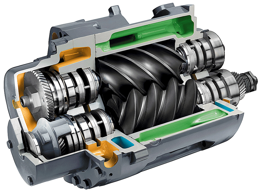 壓縮階段:封閉在壓縮腔內(nèi)的氣體隨著轉(zhuǎn)子齒槽的旋轉(zhuǎn)而逐漸被壓縮。壓縮腔的容積不斷縮小,導(dǎo)致氣體壓力和溫度升高。這一過程中,潤滑油可能被噴入壓縮腔,以起到冷卻、密封和潤滑的作用。